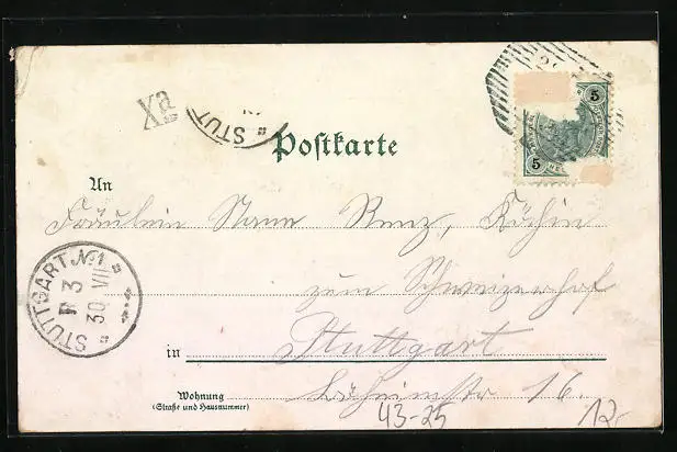 Personenbezogene Daten auf der Rückseite der Karte wurden durch blauen Textmarker unkenntlich gemacht. Die blauen Stellen sind auf die Vorderseite durchgeweicht und wirken sich negativ auf das Postkartenfoto aus