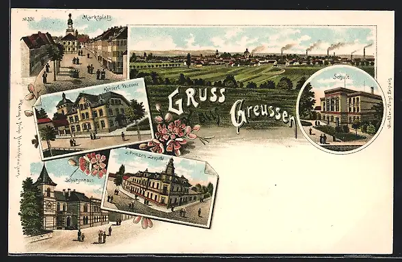 Lithographie Greussen, Schule, Marktplatz, Kaiserliches Postamt
