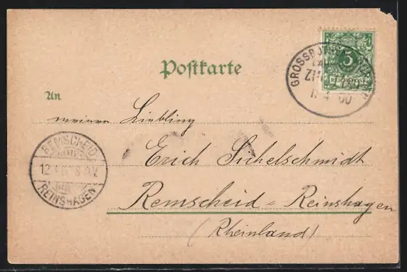 Personenbezogene Daten auf der Rückseite der Karte wurden durch blauen Textmarker unkenntlich gemacht. Die blauen Stellen sind auf die Vorderseite durchgeweicht und wirken sich negativ auf das Postkartenfoto aus