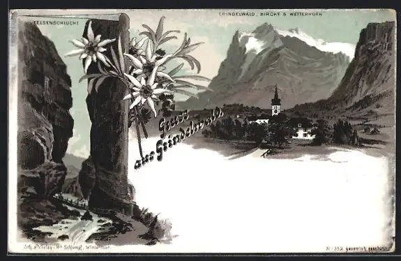 Lithographie Grindelwald, Ortsansicht, Kirche, Wetterhorn, Felsenschlucht