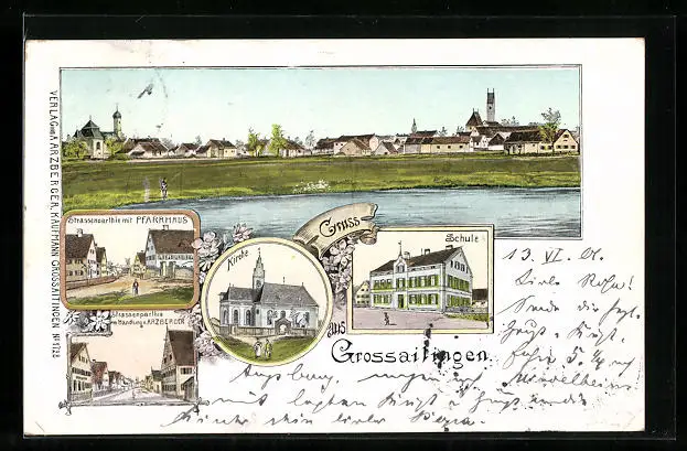 Lithographie Grossaitingen, Schule, Kirche, Pfarrhaus