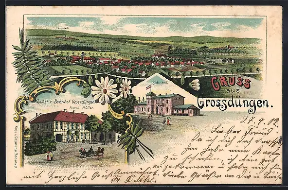 Lithographie Grossdüngen, Bahnhof, Gasthof z. Bahnhof v. Joseph Müller