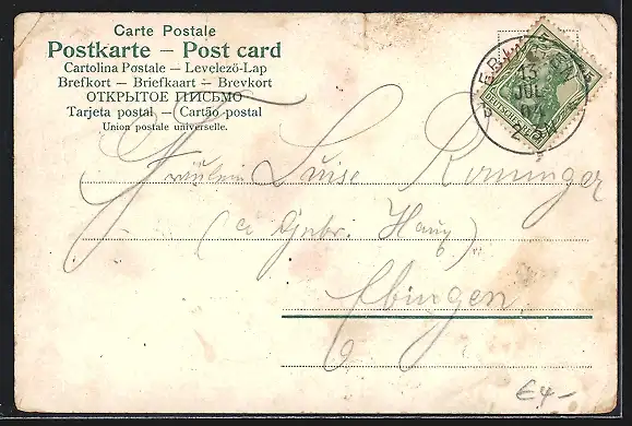 gelaufen 1904, Eckknicke oben, Einriss oben, guter Zustand