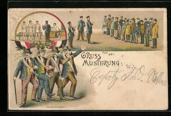 Lithographie Gruss von der Musterung, Feiernde Herren