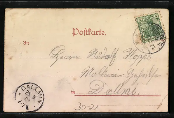 Personenbezogene Daten auf der Rückseite der Karte wurden durch blauen Textmarker unkenntlich gemacht. Die blauen Stellen sind auf die Vorderseite durchgeweicht und wirken sich negativ auf das Postkartenfoto aus
