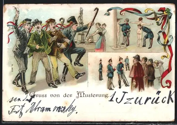 Lithographie Gruss von der Musterung, Soldatenhumor