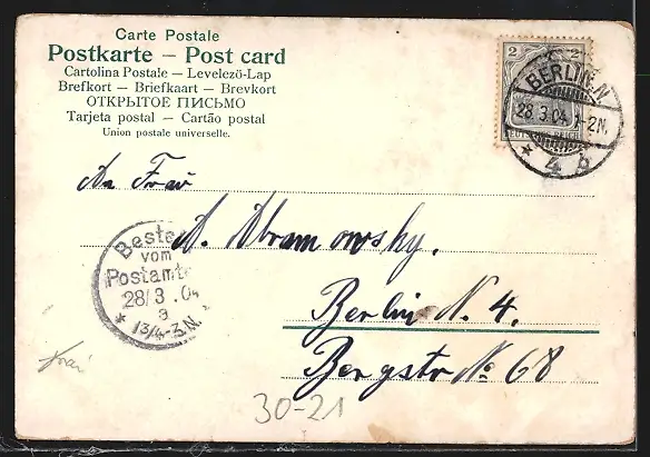 Personenbezogene Daten auf der Rückseite der Karte wurden durch blauen Textmarker unkenntlich gemacht. Die blauen Stellen sind auf die Vorderseite durchgeweicht und wirken sich negativ auf das Postkartenfoto aus