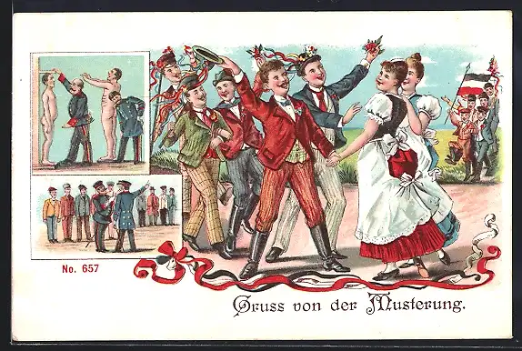 Lithographie Gruss von der Musterung, jubelnde Männer