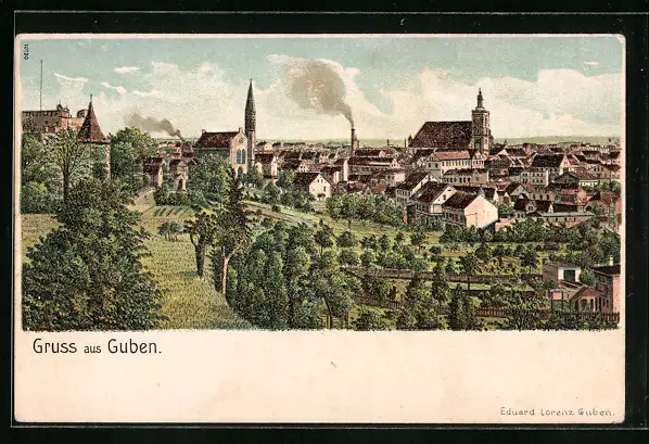 Lithographie Guben, Totalansicht aus der Vogelschau