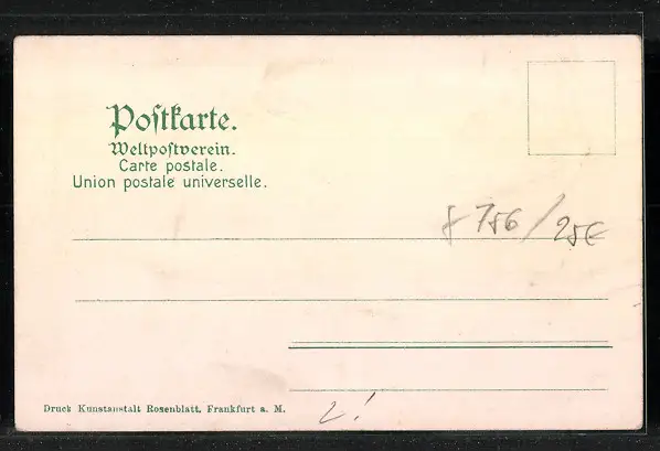 Personenbezogene Daten auf der Rückseite der Karte wurden durch blauen Textmarker unkenntlich gemacht. Die blauen Stellen sind auf die Vorderseite durchgeweicht und wirken sich negativ auf das Postkartenfoto aus