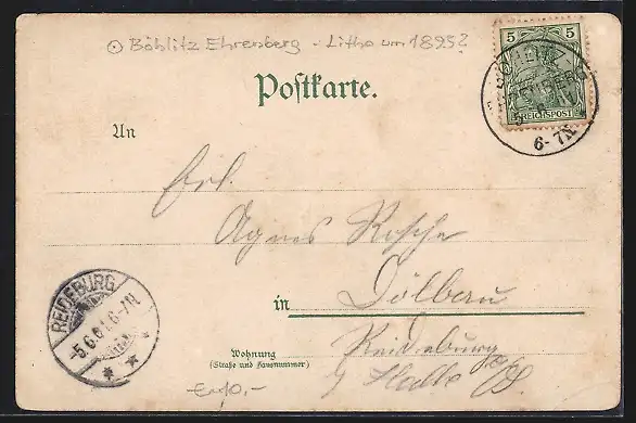 Personenbezogene Daten auf der Rückseite der Karte wurden durch blauen Textmarker unkenntlich gemacht. Die blauen Stellen sind auf die Vorderseite durchgeweicht und wirken sich negativ auf das Postkartenfoto aus