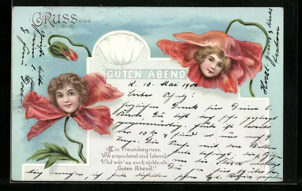 Lithographie Gutenabend, Frauenköpfe in Mohnblüten, Metamorphose