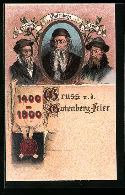 Lithographie Gutenberg-Feier 1900, Schöffer, Fust und Gutenberg