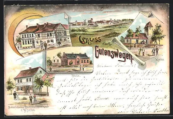 Lithographie Gutenswegen, Gasthof zum deutschen Kaiser, Schule, Kirche