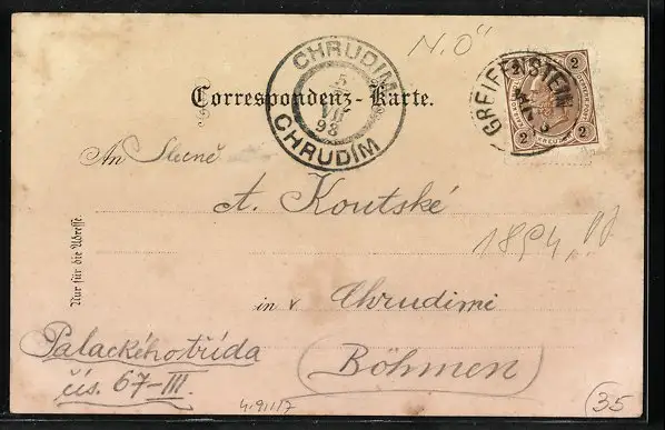 Personenbezogene Daten auf der Rückseite der Karte wurden durch blauen Textmarker unkenntlich gemacht. Die blauen Stellen sind auf die Vorderseite durchgeweicht und wirken sich negativ auf das Postkartenfoto aus