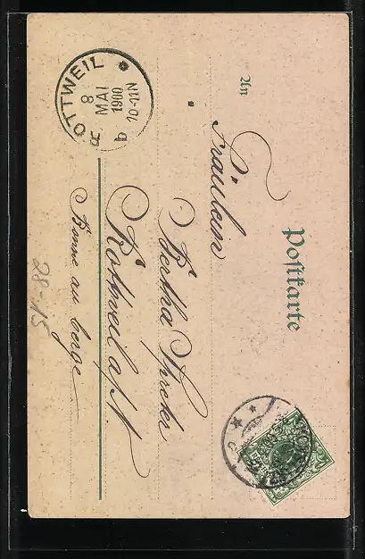 Personenbezogene Daten auf der Rückseite der Karte wurden durch blauen Textmarker unkenntlich gemacht. Die blauen Stellen sind auf die Vorderseite durchgeweicht und wirken sich negativ auf das Postkartenfoto aus