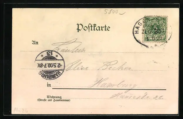 Personenbezogene Daten auf der Rückseite der Karte wurden durch blauen Textmarker unkenntlich gemacht. Die blauen Stellen sind auf die Vorderseite durchgeweicht und wirken sich negativ auf das Postkartenfoto aus
