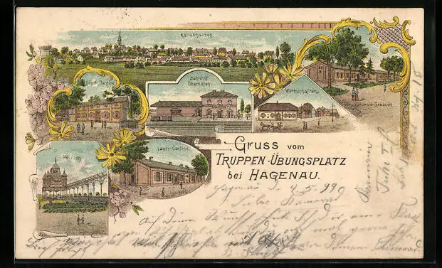 Lithographie Hagenau, Truppen-Übungsplatz, Gasthäuser, Lager-Kantine, Pavillon