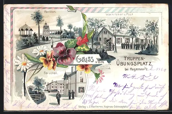 Lithographie Hagenau i. E., Truppenübungsplatz und Post, Baracken