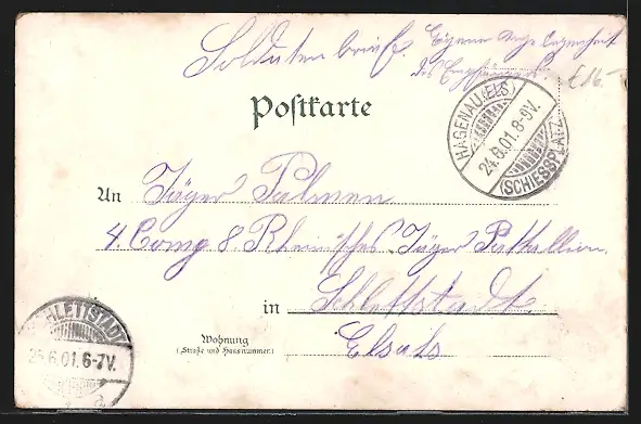 Personenbezogene Daten auf der Rückseite der Karte wurden durch blauen Textmarker unkenntlich gemacht. Die blauen Stellen sind auf die Vorderseite durchgeweicht und wirken sich negativ auf das Postkartenfoto aus