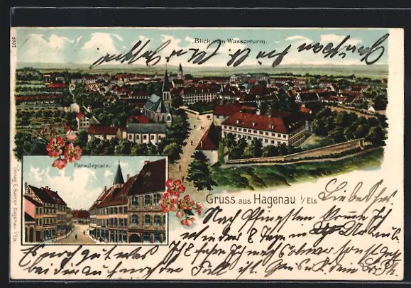 Lithographie Hagenau i. Els., Paradeplatz, Blick vom Wasserturm
