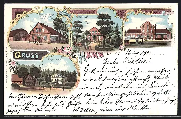 Lithographie Hahn, Bahnhof, Gasthof Hahner Hof, Gut Hahn