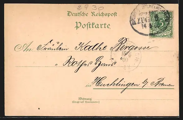 Personenbezogene Daten auf der Rückseite der Karte wurden durch blauen Textmarker unkenntlich gemacht. Die blauen Stellen sind auf die Vorderseite durchgeweicht und wirken sich negativ auf das Postkartenfoto aus