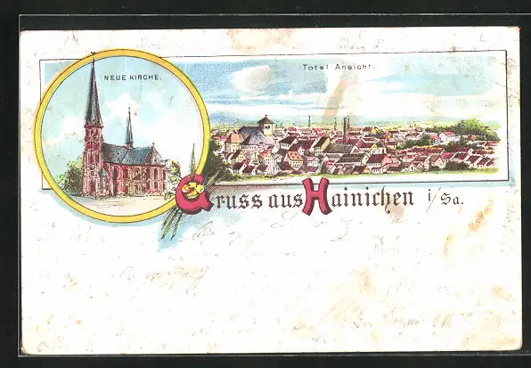 Lithographie Hainichen i. Sa., Neue Kirche, Totalansicht
