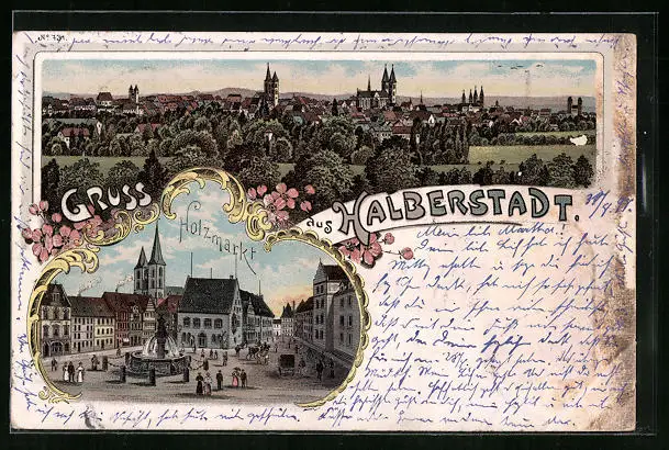 Lithographie Halberstadt, Ortsansicht mit Holzmarkt
