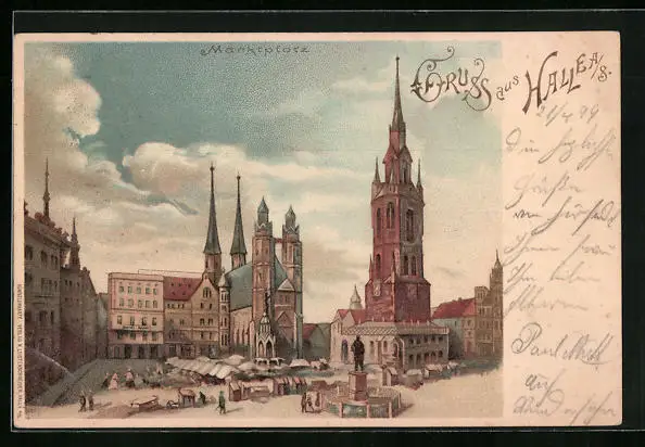Lithographie Halle /Saale, Strassenpartie am Marktplatz