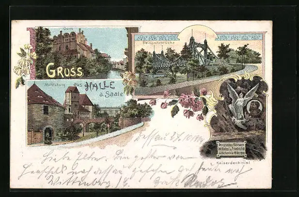 Lithographie Halle a. S., Peissnitzbrücke, Moritzburg, Kaiserdenkmal