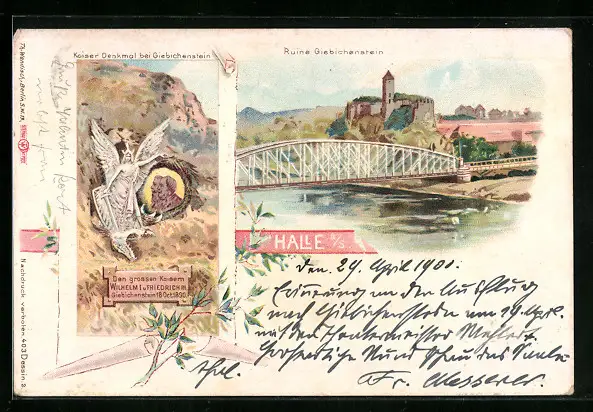 Lithographie Halle a. d. S., Ruine Giebichenstein, Kaiser Denkmal bei Giebichenstein