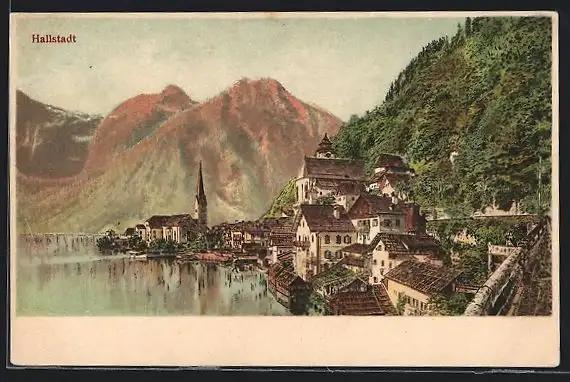 Lithographie Hallstatt, Ortsansicht am Bergsee