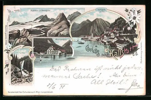 Lithographie Hallstatt, Ortsansicht mit See, Gosaumühle, Dachstein mit Simonyhütte