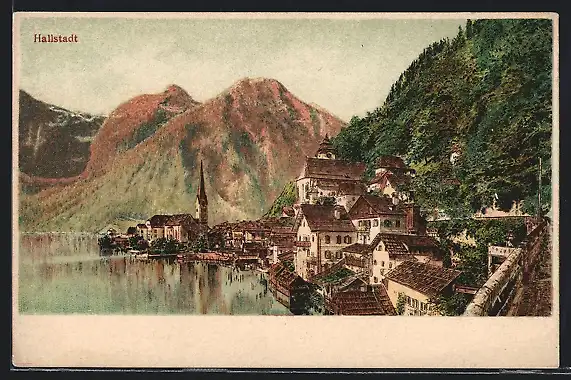 Lithographie Hallstatt, Uferpartie mit Kirche