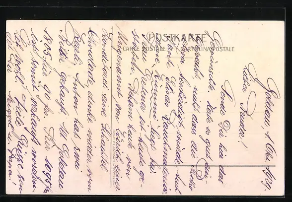 Personenbezogene Daten auf der Rückseite der Karte wurden durch blauen Textmarker unkenntlich gemacht. Die blauen Stellen sind auf die Vorderseite durchgeweicht und wirken sich negativ auf das Postkartenfoto aus