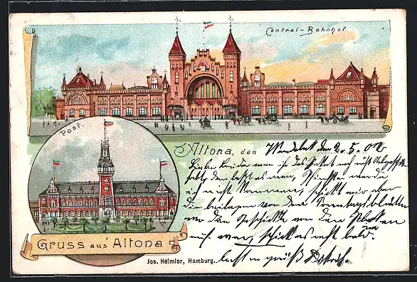 Lithographie Hamburg-Altona, Central-Bahnhof, Postgebäude