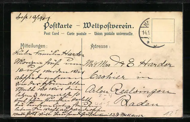 Personenbezogene Daten auf der Rückseite der Karte wurden durch blauen Textmarker unkenntlich gemacht. Die blauen Stellen sind auf die Vorderseite durchgeweicht und wirken sich negativ auf das Postkartenfoto aus