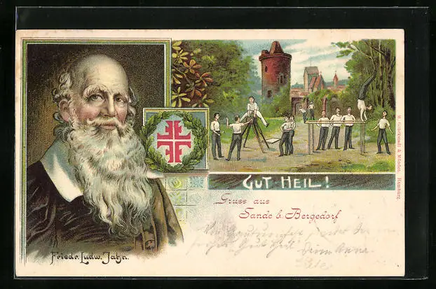 Lithographie Hamburg-Bergedorf, Portrait von Friedr. Ludw. Jahn, Trainierende Turner