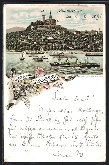 Lithographie Hamburg-Blankenese, Dampfer vor dem Süllberg