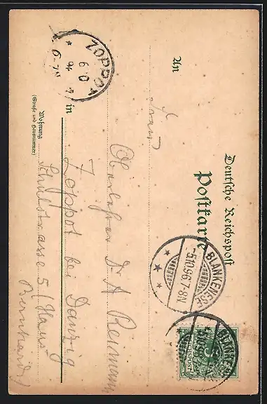 Personenbezogene Daten auf der Rückseite der Karte wurden durch blauen Textmarker unkenntlich gemacht. Die blauen Stellen sind auf die Vorderseite durchgeweicht und wirken sich negativ auf das Postkartenfoto aus
