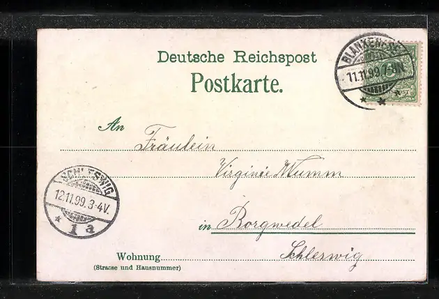 Personenbezogene Daten auf der Rückseite der Karte wurden durch blauen Textmarker unkenntlich gemacht. Die blauen Stellen sind auf die Vorderseite durchgeweicht und wirken sich negativ auf das Postkartenfoto aus