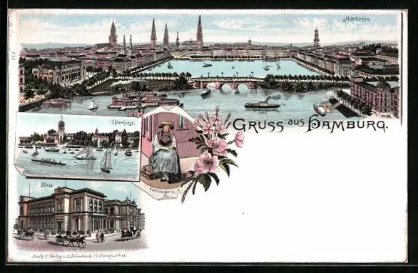 Lithographie Hamburg, Börse, Alsterbassin, Uhlenhorst