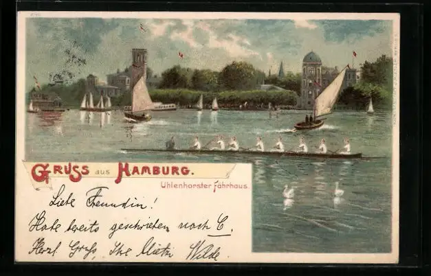 Lithographie Hamburg, Flusspartie mit Booten, Uhlenhorster Fährhaus