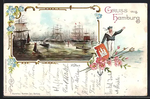 Lithographie Hamburg, Hafen und Matrose mit Wappen