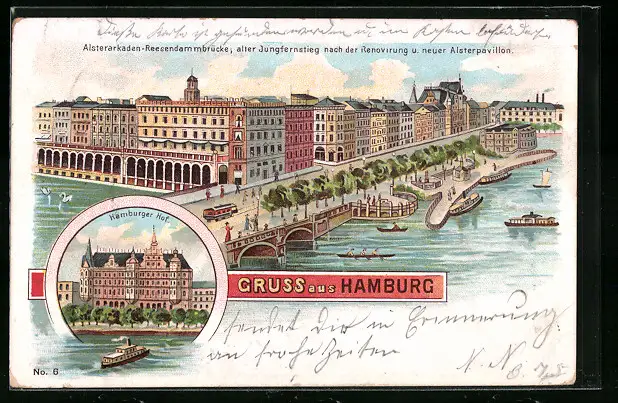 Lithographie Hamburg, Hamburger Hof, Alsterarkaden, Reesendammbrücke