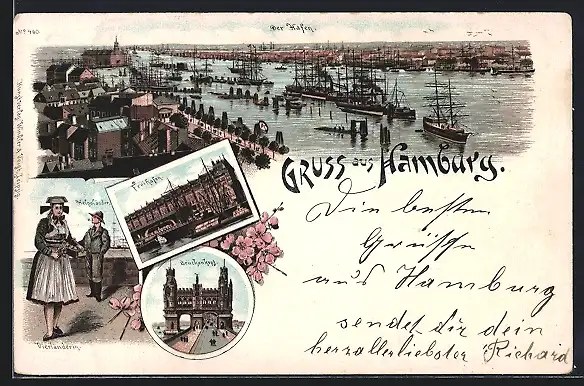 Lithographie Hamburg, Helgoländer, Brückenkopf und Freihafen