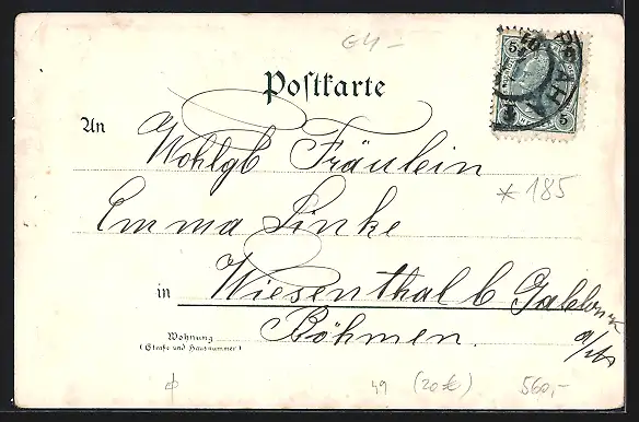 Personenbezogene Daten auf der Rückseite der Karte wurden durch blauen Textmarker unkenntlich gemacht. Die blauen Stellen sind auf die Vorderseite durchgeweicht und wirken sich negativ auf das Postkartenfoto aus