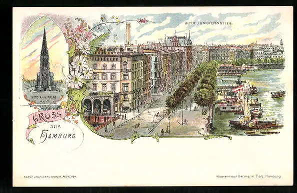 Lithographie Hamburg-Neustadt, Alter Jungfernstieg mit Dampferanlegestelle, Nicolai-Kirche