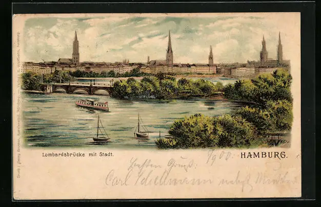 Lithographie Hamburg-Neustadt, Lombardsbrücke mit Stadt